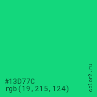Цвет #13D77C в цветовой модели RGB обозначается тремя октетами (19, 215, 124) в десятичном формате и #13D77C в шестнадцатиричном (hex) формате, которые являются интенсивностью красного 19 (hex 13), интенсивность зелёного 215 (hex D7) и интенсивность синего 124 (hex 7C).