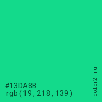 Цвет #13DA8B в цветовой модели RGB обозначается тремя октетами (19, 218, 139) в десятичном формате и #13DA8B в шестнадцатиричном (hex) формате, которые являются интенсивностью красного 19 (hex 13), интенсивность зелёного 218 (hex DA) и интенсивность синего 139 (hex 8B).