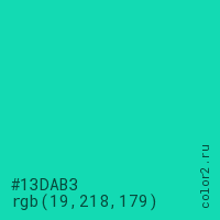 Цвет #13DAB3 в цветовой модели RGB обозначается тремя октетами (19, 218, 179) в десятичном формате и #13DAB3 в шестнадцатиричном (hex) формате, которые являются интенсивностью красного 19 (hex 13), интенсивность зелёного 218 (hex DA) и интенсивность синего 179 (hex B3).