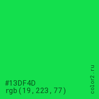 Цвет #13DF4D в цветовой модели RGB обозначается тремя октетами (19, 223, 77) в десятичном формате и #13DF4D в шестнадцатиричном (hex) формате, которые являются интенсивностью красного 19 (hex 13), интенсивность зелёного 223 (hex DF) и интенсивность синего 77 (hex 4D).