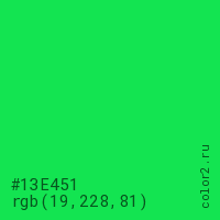 Цвет #13E451 в цветовой модели RGB обозначается тремя октетами (19, 228, 81) в десятичном формате и #13E451 в шестнадцатиричном (hex) формате, которые являются интенсивностью красного 19 (hex 13), интенсивность зелёного 228 (hex E4) и интенсивность синего 81 (hex 51).