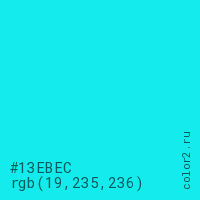 Цвет #13EBEC в цветовой модели RGB обозначается тремя октетами (19, 235, 236) в десятичном формате и #13EBEC в шестнадцатиричном (hex) формате, которые являются интенсивностью красного 19 (hex 13), интенсивность зелёного 235 (hex EB) и интенсивность синего 236 (hex EC).