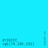 Цвет #13ECFC в цветовой модели RGB обозначается тремя октетами (19, 236, 252) в десятичном формате и #13ECFC в шестнадцатиричном (hex) формате, которые являются интенсивностью красного 19 (hex 13), интенсивность зелёного 236 (hex EC) и интенсивность синего 252 (hex FC).