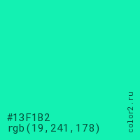 Цвет #13F1B2 в цветовой модели RGB обозначается тремя октетами (19, 241, 178) в десятичном формате и #13F1B2 в шестнадцатиричном (hex) формате, которые являются интенсивностью красного 19 (hex 13), интенсивность зелёного 241 (hex F1) и интенсивность синего 178 (hex B2).
