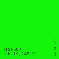Цвет #13F509 в цветовой модели RGB обозначается тремя октетами (19, 245, 9) в десятичном формате и #13F509 в шестнадцатиричном (hex) формате, которые являются интенсивностью красного 19 (hex 13), интенсивность зелёного 245 (hex F5) и интенсивность синего 9 (hex 09).