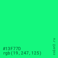 Цвет #13F77D в цветовой модели RGB обозначается тремя октетами (19, 247, 125) в десятичном формате и #13F77D в шестнадцатиричном (hex) формате, которые являются интенсивностью красного 19 (hex 13), интенсивность зелёного 247 (hex F7) и интенсивность синего 125 (hex 7D).