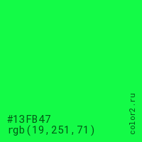 Цвет #13FB47 в цветовой модели RGB обозначается тремя октетами (19, 251, 71) в десятичном формате и #13FB47 в шестнадцатиричном (hex) формате, которые являются интенсивностью красного 19 (hex 13), интенсивность зелёного 251 (hex FB) и интенсивность синего 71 (hex 47).
