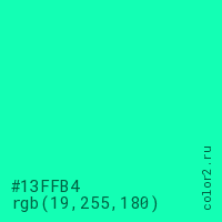 Цвет #13FFB4 в цветовой модели RGB обозначается тремя октетами (19, 255, 180) в десятичном формате и #13FFB4 в шестнадцатиричном (hex) формате, которые являются интенсивностью красного 19 (hex 13), интенсивность зелёного 255 (hex FF) и интенсивность синего 180 (hex B4).