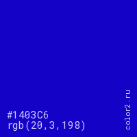 Цвет #1403C6 в цветовой модели RGB обозначается тремя октетами (20, 3, 198) в десятичном формате и #1403C6 в шестнадцатиричном (hex) формате, которые являются интенсивностью красного 20 (hex 14), интенсивность зелёного 3 (hex 03) и интенсивность синего 198 (hex C6).