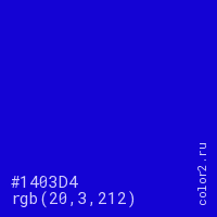 Цвет #1403D4 в цветовой модели RGB обозначается тремя октетами (20, 3, 212) в десятичном формате и #1403D4 в шестнадцатиричном (hex) формате, которые являются интенсивностью красного 20 (hex 14), интенсивность зелёного 3 (hex 03) и интенсивность синего 212 (hex D4).