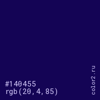 Цвет #140455 в цветовой модели RGB обозначается тремя октетами (20, 4, 85) в десятичном формате и #140455 в шестнадцатиричном (hex) формате, которые являются интенсивностью красного 20 (hex 14), интенсивность зелёного 4 (hex 04) и интенсивность синего 85 (hex 55).