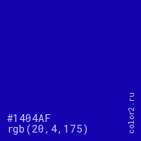 Цвет #1404AF в цветовой модели RGB обозначается тремя октетами (20, 4, 175) в десятичном формате и #1404AF в шестнадцатиричном (hex) формате, которые являются интенсивностью красного 20 (hex 14), интенсивность зелёного 4 (hex 04) и интенсивность синего 175 (hex AF).