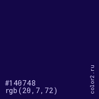 Цвет #140748 в цветовой модели RGB обозначается тремя октетами (20, 7, 72) в десятичном формате и #140748 в шестнадцатиричном (hex) формате, которые являются интенсивностью красного 20 (hex 14), интенсивность зелёного 7 (hex 07) и интенсивность синего 72 (hex 48).