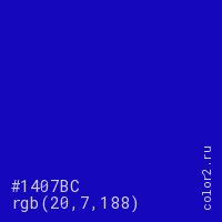 Цвет #1407BC в цветовой модели RGB обозначается тремя октетами (20, 7, 188) в десятичном формате и #1407BC в шестнадцатиричном (hex) формате, которые являются интенсивностью красного 20 (hex 14), интенсивность зелёного 7 (hex 07) и интенсивность синего 188 (hex BC).