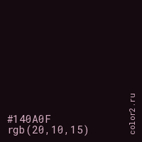Цвет #140A0F в цветовой модели RGB обозначается тремя октетами (20, 10, 15) в десятичном формате и #140A0F в шестнадцатиричном (hex) формате, которые являются интенсивностью красного 20 (hex 14), интенсивность зелёного 10 (hex 0A) и интенсивность синего 15 (hex 0F).
