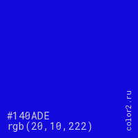 Цвет #140ADE в цветовой модели RGB обозначается тремя октетами (20, 10, 222) в десятичном формате и #140ADE в шестнадцатиричном (hex) формате, которые являются интенсивностью красного 20 (hex 14), интенсивность зелёного 10 (hex 0A) и интенсивность синего 222 (hex DE).