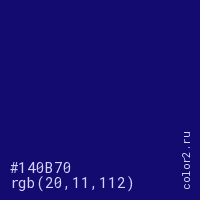 Цвет #140B70 в цветовой модели RGB обозначается тремя октетами (20, 11, 112) в десятичном формате и #140B70 в шестнадцатиричном (hex) формате, которые являются интенсивностью красного 20 (hex 14), интенсивность зелёного 11 (hex 0B) и интенсивность синего 112 (hex 70).
