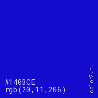 Цвет #140BCE в цветовой модели RGB обозначается тремя октетами (20, 11, 206) в десятичном формате и #140BCE в шестнадцатиричном (hex) формате, которые являются интенсивностью красного 20 (hex 14), интенсивность зелёного 11 (hex 0B) и интенсивность синего 206 (hex CE).