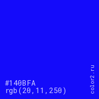 Цвет #140BFA в цветовой модели RGB обозначается тремя октетами (20, 11, 250) в десятичном формате и #140BFA в шестнадцатиричном (hex) формате, которые являются интенсивностью красного 20 (hex 14), интенсивность зелёного 11 (hex 0B) и интенсивность синего 250 (hex FA).