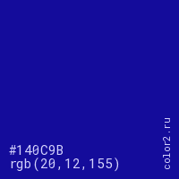 Цвет #140C9B в цветовой модели RGB обозначается тремя октетами (20, 12, 155) в десятичном формате и #140C9B в шестнадцатиричном (hex) формате, которые являются интенсивностью красного 20 (hex 14), интенсивность зелёного 12 (hex 0C) и интенсивность синего 155 (hex 9B).