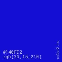 Цвет #140FD2 в цветовой модели RGB обозначается тремя октетами (20, 15, 210) в десятичном формате и #140FD2 в шестнадцатиричном (hex) формате, которые являются интенсивностью красного 20 (hex 14), интенсивность зелёного 15 (hex 0F) и интенсивность синего 210 (hex D2).