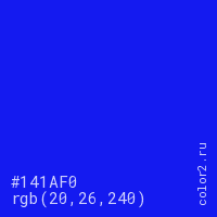 Цвет #141AF0 в цветовой модели RGB обозначается тремя октетами (20, 26, 240) в десятичном формате и #141AF0 в шестнадцатиричном (hex) формате, которые являются интенсивностью красного 20 (hex 14), интенсивность зелёного 26 (hex 1A) и интенсивность синего 240 (hex F0).