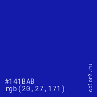 Цвет #141BAB в цветовой модели RGB обозначается тремя октетами (20, 27, 171) в десятичном формате и #141BAB в шестнадцатиричном (hex) формате, которые являются интенсивностью красного 20 (hex 14), интенсивность зелёного 27 (hex 1B) и интенсивность синего 171 (hex AB).