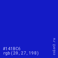 Цвет #141BC6 в цветовой модели RGB обозначается тремя октетами (20, 27, 198) в десятичном формате и #141BC6 в шестнадцатиричном (hex) формате, которые являются интенсивностью красного 20 (hex 14), интенсивность зелёного 27 (hex 1B) и интенсивность синего 198 (hex C6).