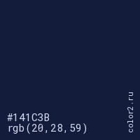 Цвет #141C3B в цветовой модели RGB обозначается тремя октетами (20, 28, 59) в десятичном формате и #141C3B в шестнадцатиричном (hex) формате, которые являются интенсивностью красного 20 (hex 14), интенсивность зелёного 28 (hex 1C) и интенсивность синего 59 (hex 3B).