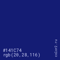 Цвет #141C74 в цветовой модели RGB обозначается тремя октетами (20, 28, 116) в десятичном формате и #141C74 в шестнадцатиричном (hex) формате, которые являются интенсивностью красного 20 (hex 14), интенсивность зелёного 28 (hex 1C) и интенсивность синего 116 (hex 74).