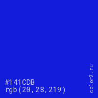 Цвет #141CDB в цветовой модели RGB обозначается тремя октетами (20, 28, 219) в десятичном формате и #141CDB в шестнадцатиричном (hex) формате, которые являются интенсивностью красного 20 (hex 14), интенсивность зелёного 28 (hex 1C) и интенсивность синего 219 (hex DB).