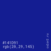 Цвет #141D91 в цветовой модели RGB обозначается тремя октетами (20, 29, 145) в десятичном формате и #141D91 в шестнадцатиричном (hex) формате, которые являются интенсивностью красного 20 (hex 14), интенсивность зелёного 29 (hex 1D) и интенсивность синего 145 (hex 91).