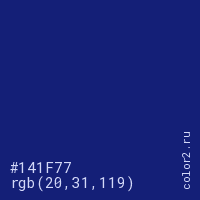Цвет #141F77 в цветовой модели RGB обозначается тремя октетами (20, 31, 119) в десятичном формате и #141F77 в шестнадцатиричном (hex) формате, которые являются интенсивностью красного 20 (hex 14), интенсивность зелёного 31 (hex 1F) и интенсивность синего 119 (hex 77).