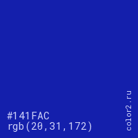 Цвет #141FAC в цветовой модели RGB обозначается тремя октетами (20, 31, 172) в десятичном формате и #141FAC в шестнадцатиричном (hex) формате, которые являются интенсивностью красного 20 (hex 14), интенсивность зелёного 31 (hex 1F) и интенсивность синего 172 (hex AC).