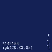 Цвет #142155 в цветовой модели RGB обозначается тремя октетами (20, 33, 85) в десятичном формате и #142155 в шестнадцатиричном (hex) формате, которые являются интенсивностью красного 20 (hex 14), интенсивность зелёного 33 (hex 21) и интенсивность синего 85 (hex 55).