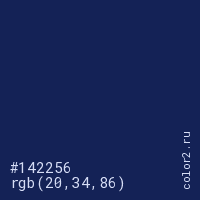 Цвет #142256 в цветовой модели RGB обозначается тремя октетами (20, 34, 86) в десятичном формате и #142256 в шестнадцатиричном (hex) формате, которые являются интенсивностью красного 20 (hex 14), интенсивность зелёного 34 (hex 22) и интенсивность синего 86 (hex 56).
