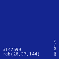 Цвет #142590 в цветовой модели RGB обозначается тремя октетами (20, 37, 144) в десятичном формате и #142590 в шестнадцатиричном (hex) формате, которые являются интенсивностью красного 20 (hex 14), интенсивность зелёного 37 (hex 25) и интенсивность синего 144 (hex 90).