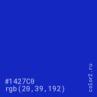 Цвет #1427C0 в цветовой модели RGB обозначается тремя октетами (20, 39, 192) в десятичном формате и #1427C0 в шестнадцатиричном (hex) формате, которые являются интенсивностью красного 20 (hex 14), интенсивность зелёного 39 (hex 27) и интенсивность синего 192 (hex C0).