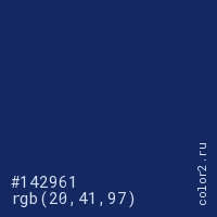Цвет #142961 в цветовой модели RGB обозначается тремя октетами (20, 41, 97) в десятичном формате и #142961 в шестнадцатиричном (hex) формате, которые являются интенсивностью красного 20 (hex 14), интенсивность зелёного 41 (hex 29) и интенсивность синего 97 (hex 61).