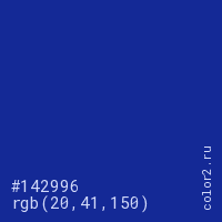 Цвет #142996 в цветовой модели RGB обозначается тремя октетами (20, 41, 150) в десятичном формате и #142996 в шестнадцатиричном (hex) формате, которые являются интенсивностью красного 20 (hex 14), интенсивность зелёного 41 (hex 29) и интенсивность синего 150 (hex 96).