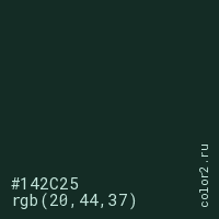 Цвет #142C25 в цветовой модели RGB обозначается тремя октетами (20, 44, 37) в десятичном формате и #142C25 в шестнадцатиричном (hex) формате, которые являются интенсивностью красного 20 (hex 14), интенсивность зелёного 44 (hex 2C) и интенсивность синего 37 (hex 25).