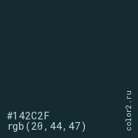 Цвет #142C2F в цветовой модели RGB обозначается тремя октетами (20, 44, 47) в десятичном формате и #142C2F в шестнадцатиричном (hex) формате, которые являются интенсивностью красного 20 (hex 14), интенсивность зелёного 44 (hex 2C) и интенсивность синего 47 (hex 2F).