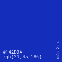 Цвет #142DBA в цветовой модели RGB обозначается тремя октетами (20, 45, 186) в десятичном формате и #142DBA в шестнадцатиричном (hex) формате, которые являются интенсивностью красного 20 (hex 14), интенсивность зелёного 45 (hex 2D) и интенсивность синего 186 (hex BA).