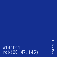 Цвет #142F91 в цветовой модели RGB обозначается тремя октетами (20, 47, 145) в десятичном формате и #142F91 в шестнадцатиричном (hex) формате, которые являются интенсивностью красного 20 (hex 14), интенсивность зелёного 47 (hex 2F) и интенсивность синего 145 (hex 91).