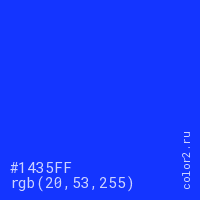 Цвет #1435FF в цветовой модели RGB обозначается тремя октетами (20, 53, 255) в десятичном формате и #1435FF в шестнадцатиричном (hex) формате, которые являются интенсивностью красного 20 (hex 14), интенсивность зелёного 53 (hex 35) и интенсивность синего 255 (hex FF).
