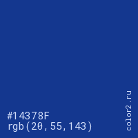 Цвет #14378F в цветовой модели RGB обозначается тремя октетами (20, 55, 143) в десятичном формате и #14378F в шестнадцатиричном (hex) формате, которые являются интенсивностью красного 20 (hex 14), интенсивность зелёного 55 (hex 37) и интенсивность синего 143 (hex 8F).