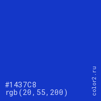 Цвет #1437C8 в цветовой модели RGB обозначается тремя октетами (20, 55, 200) в десятичном формате и #1437C8 в шестнадцатиричном (hex) формате, которые являются интенсивностью красного 20 (hex 14), интенсивность зелёного 55 (hex 37) и интенсивность синего 200 (hex C8).