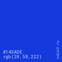 Цвет #143ADE в цветовой модели RGB обозначается тремя октетами (20, 58, 222) в десятичном формате и #143ADE в шестнадцатиричном (hex) формате, которые являются интенсивностью красного 20 (hex 14), интенсивность зелёного 58 (hex 3A) и интенсивность синего 222 (hex DE).
