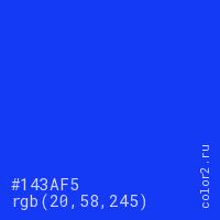 Цвет #143AF5 в цветовой модели RGB обозначается тремя октетами (20, 58, 245) в десятичном формате и #143AF5 в шестнадцатиричном (hex) формате, которые являются интенсивностью красного 20 (hex 14), интенсивность зелёного 58 (hex 3A) и интенсивность синего 245 (hex F5).