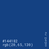 Цвет #144182 в цветовой модели RGB обозначается тремя октетами (20, 65, 130) в десятичном формате и #144182 в шестнадцатиричном (hex) формате, которые являются интенсивностью красного 20 (hex 14), интенсивность зелёного 65 (hex 41) и интенсивность синего 130 (hex 82).
